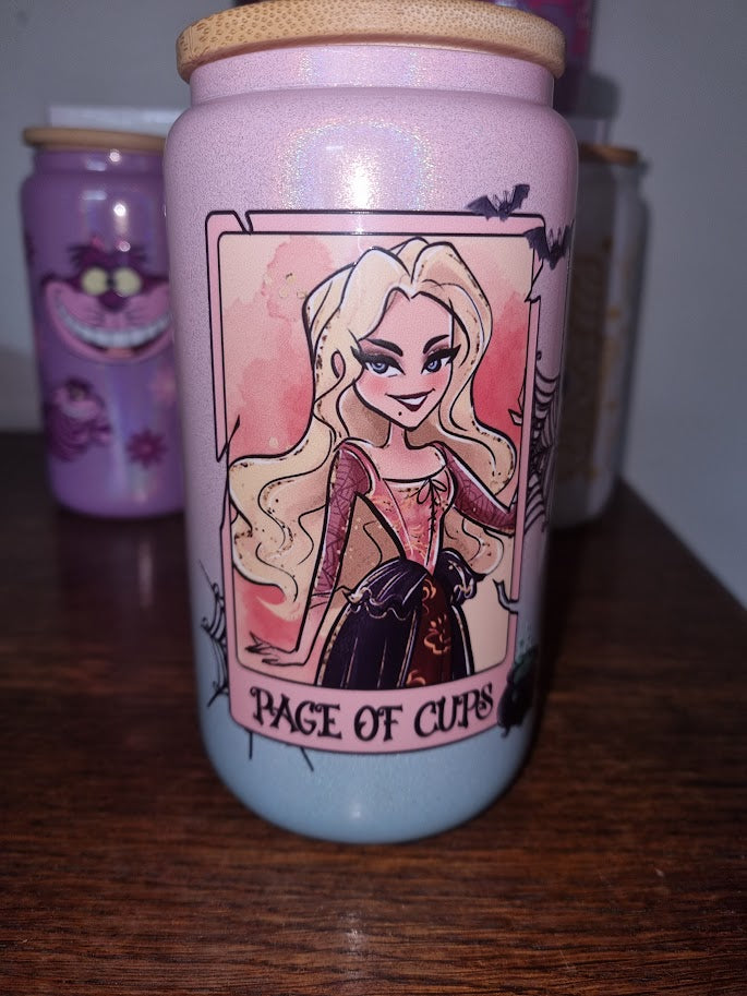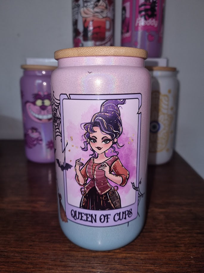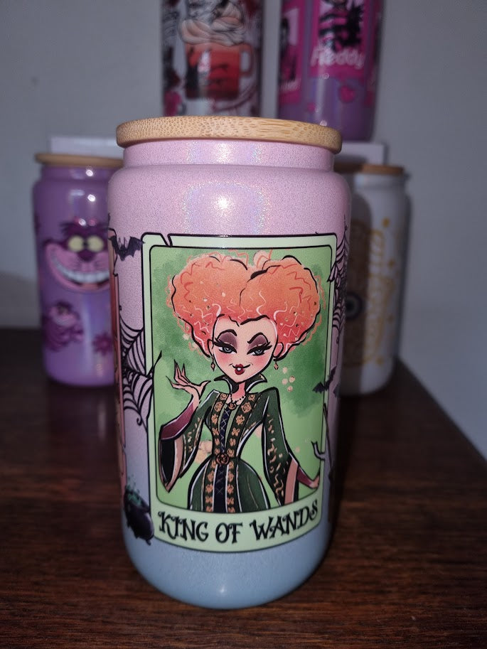 This Hocus Pocus drinking glass features an enchanting pink and blue shimmer design that captures the magical theme perfectly. Crafted from durable glass, it includes a sustainable bamboo lid and a reusable plastic straw, combining style with practicality. Ideal for keeping beverages covered and reducing spills, this glass is a functional yet charming addition for everyday use or themed occasions.